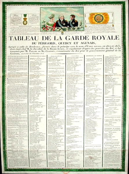 Reproduction, ci-dessus, d'un tableau similaire à celui du corps désigné sous le nom de Garde royale, à pied, de Bordeaux. Les éléments de la garde royale du Périgord, du Quercy et de l'Agenais, s'estimant lésés de n'avoir point obtenu le Brassard, alors que leurs unités relevaient du commandement supérieur de Taffart de Saint-Germain, s'adressèrent au roi pour tenter de régulariser cette situation et obtenir gain de cause. Cette demande ne fut pas agréée par le roi et, finalement, il n'y eut en réalité, au titre unique de Garde royale du Périgord, que quatre nominations : celles du chevalier et de l'abbé de La Roche-Aymon, de Cosne de Sanzillon, et d'Augustin d'Arlot de Saint-Saud.