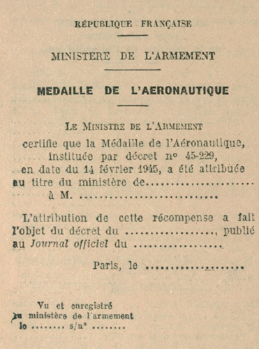 Références : Décret du 16 mai 1949 relatif à la médaille de l'aéronautique ;