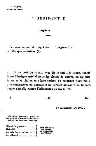 La Chambre des députés a voté, dans sa séance du 27 juillet 1916, la création d'un insigne spécial destiné aux blessés de guerre ou aux militaires retraités, mis hors cadres ou réformés pour maladies contractées ou aggravées au service.
