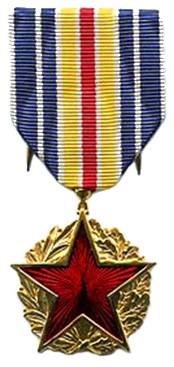 Médaille uniface constituée d'un module bronze doré, de 30 mm, constitué d'une étoile à 5 branches en émail rouge vif entourée d'une couronne mi-feuilles de chêne, mi-feuilles de laurier