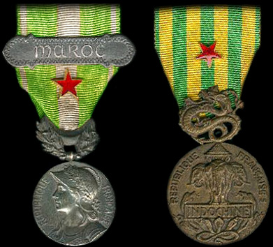 Exemples de port réglementaire de l'insigne sur deux médailles commémoratives, Maroc et Indochine.