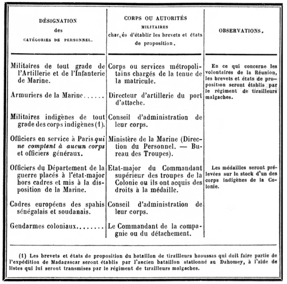 Aux termes même de la loi, cette distinction est exclusivement réservée à la commémoration des opérations militaires effectuées dans les colonies françaises ou pays de protectorat. Elle ne saurait en outre, tout naturellement, être accordée pour participation à des expéditions qui ont déjà donné lieu à la délivrance de médailles commémoratives spéciales, telles que celles du Dahomey, de Madagascar, du Tonkin, etc.