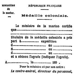 « Il est créé une médaille coloniale unique, destinée à récompenser les services militaires dans les colonies, et résultant, soit d'un séjour prolongé dans les colonies ou pays de protectorat, soit de la participation, dans une colonie quelconque, à des opérations de guerre.