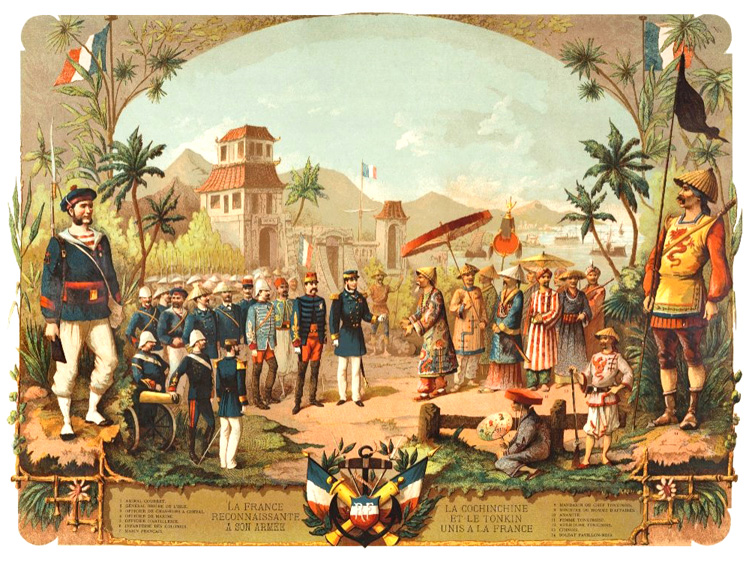 Durant trois années ( 1883, 1884 et 1885 ), les marins de l’escadre commandée par l’amiral Amédée Courbet, les soldats de l’infanterie de marine, des escadrons de spahis et chasseurs d’Afrique, des bataillons de zouaves, tirailleurs algériens et les légionnaires, placés sous les ordres des généraux Charles-Théodore Millot puis Philippe, Marie, Henri Roussel de Courcy, opéreront au Tonkin, en Annam et en Chine. Les opérations se termineront par la signature, le 9 juin 1885, du second traité de T’ien-tsin ( Tianjin ) avec la Chine.