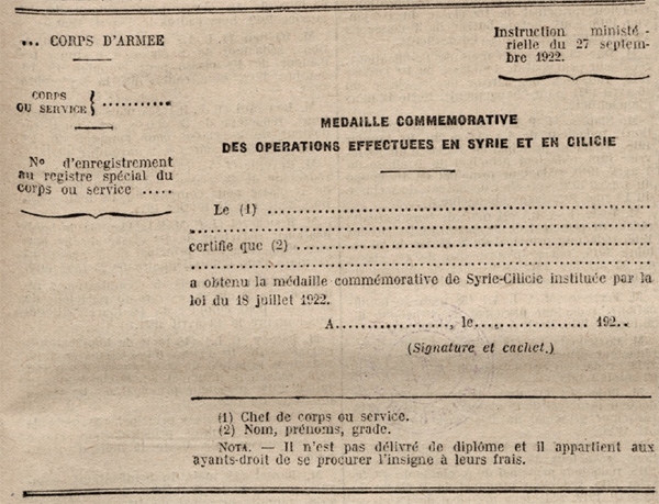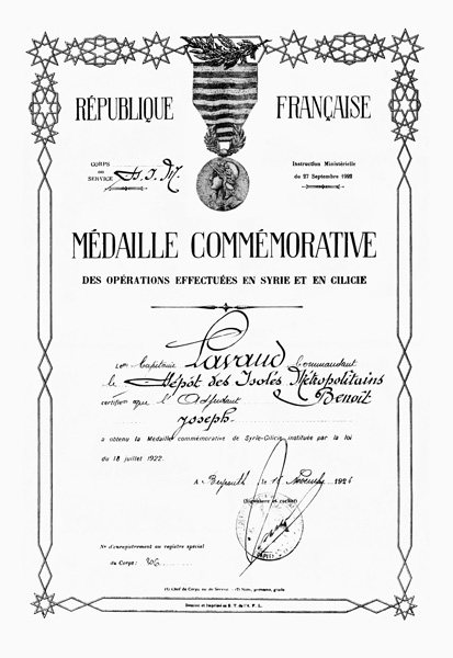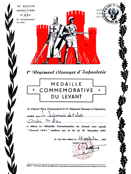 Certificat pour une médaille commémorative du Levant, décernée en 1942