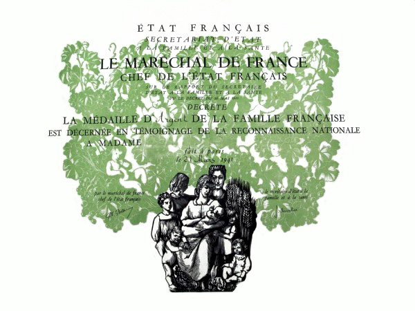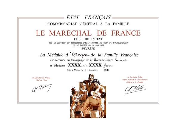 Diplôme remis par l'État français en 1942 pour une médaille d'Argent