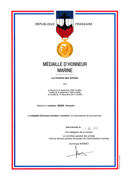 Diplôme "Marine" délivré en 2018 pour une médaille de vermeil