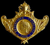 L’insigne évolua à la chute du second Empire, en 1870, par le décret du 8 novembre, avec le remplacement de l’aigle par un trophée d’armes biface et la disparition de l’effigie de l’empereur qui fut remplacée par l’effigie de la République couronnée de lauriers et entourée par la légende REPUBLIQUE FRANCAISE * 1870 *.